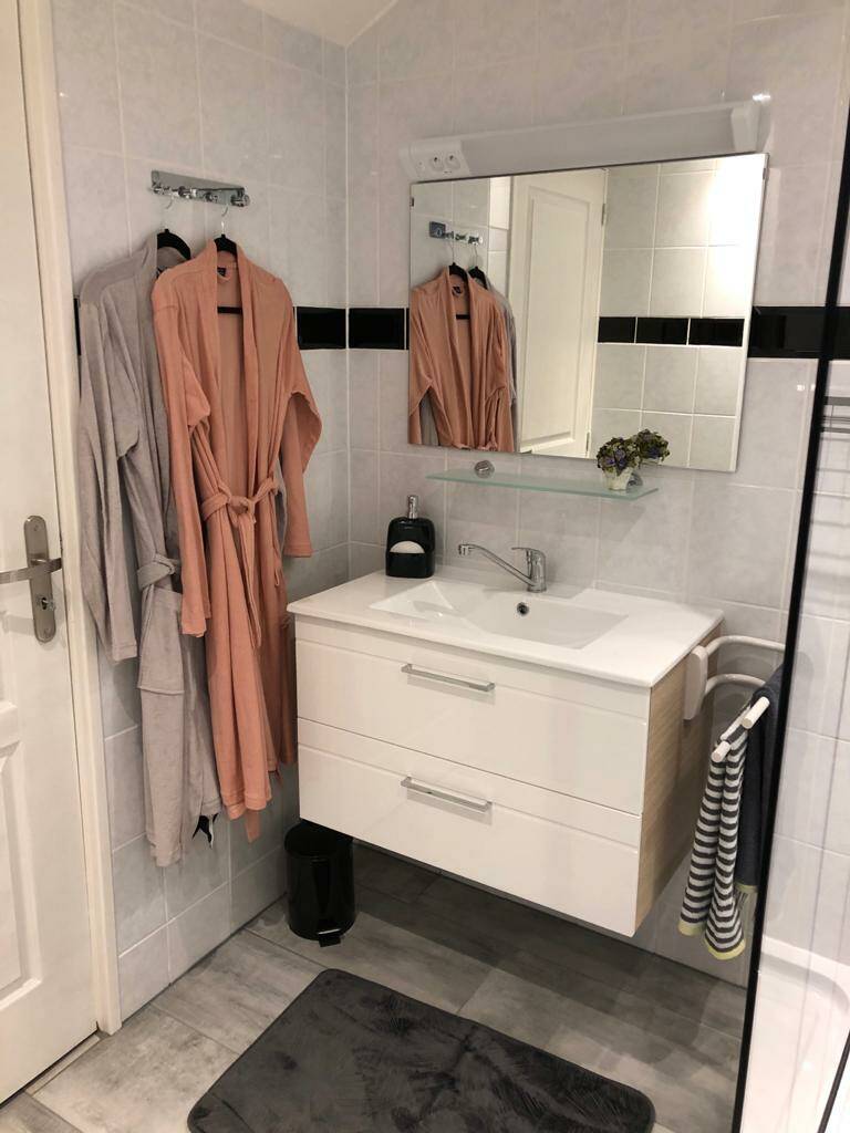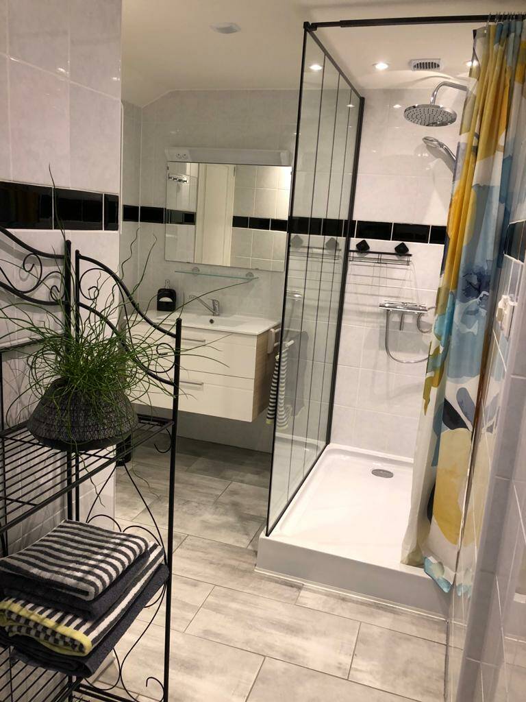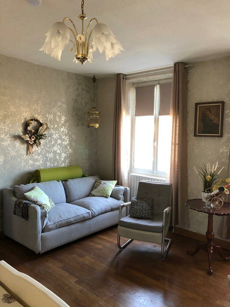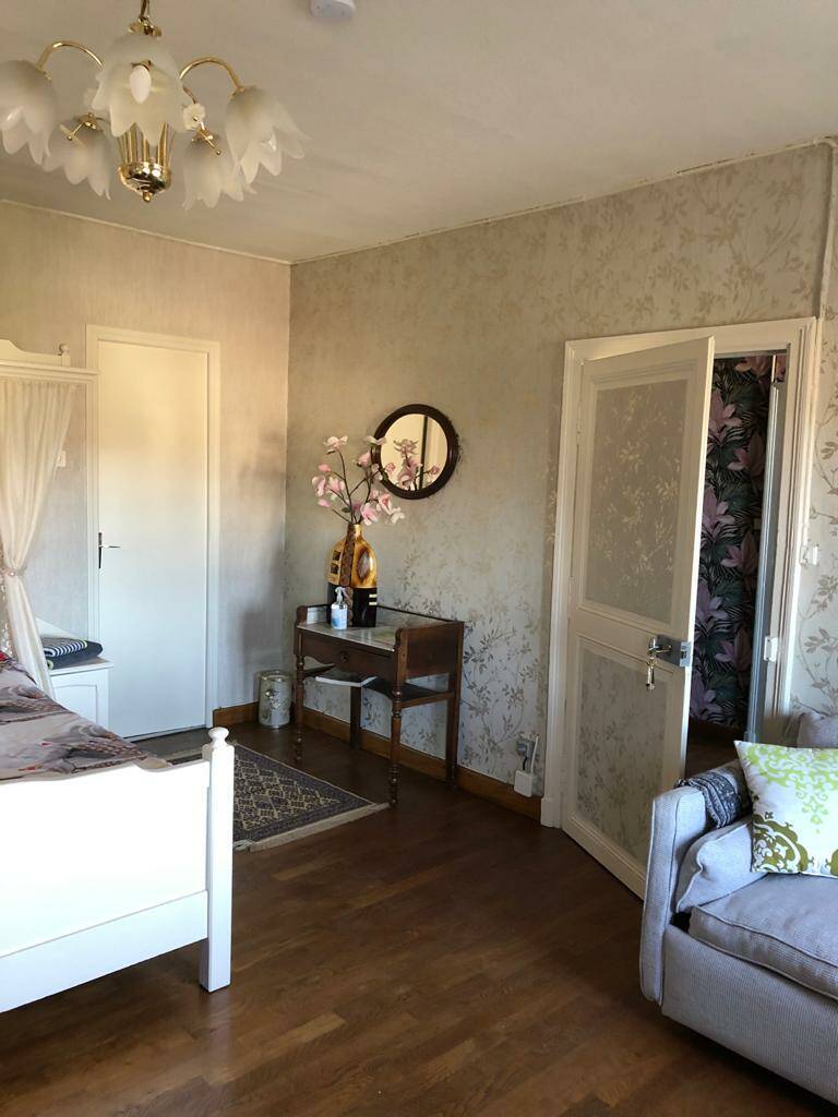De smaakvol ingerichte kamer is ingericht met tafel met stoelen, tweepersoonsbed,